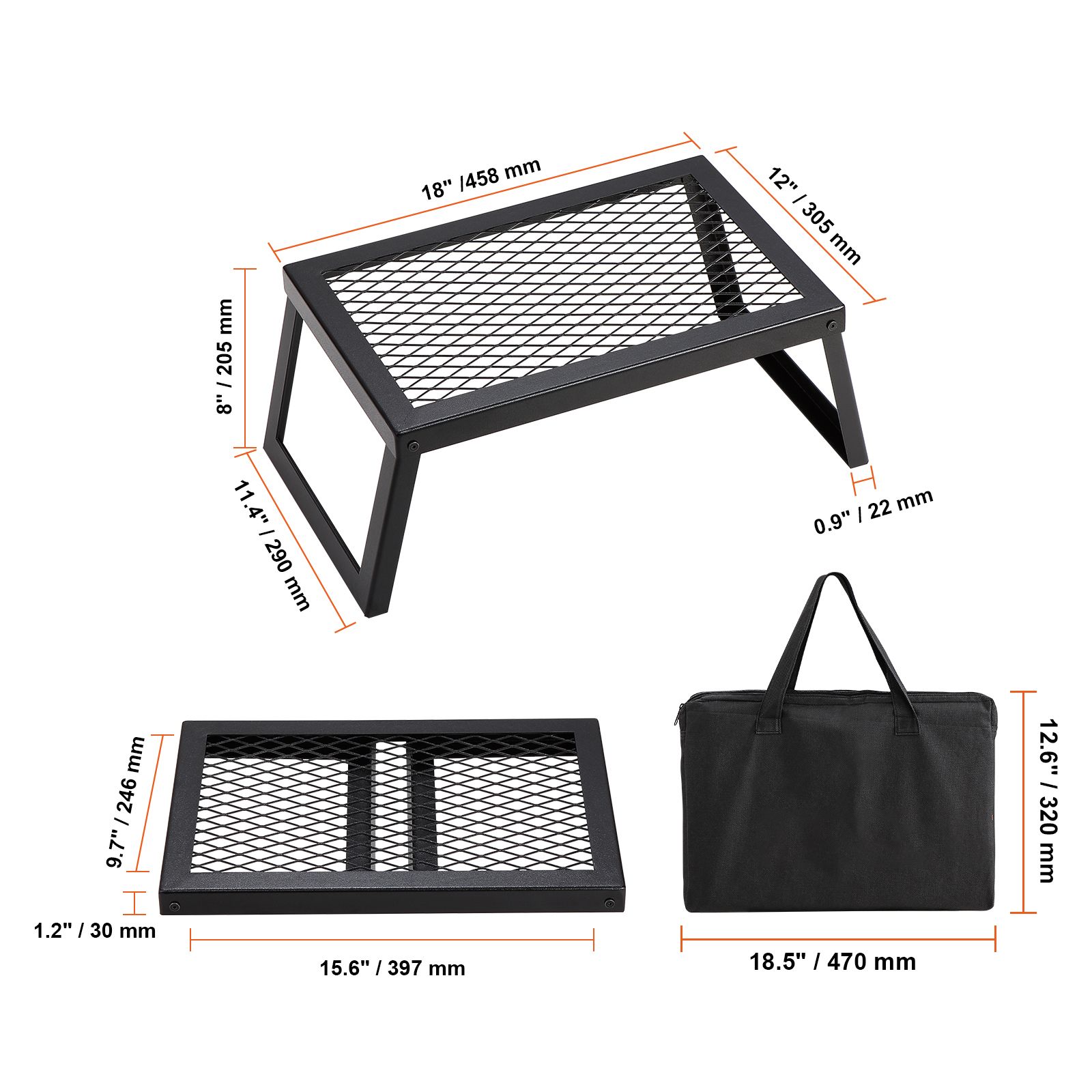 1.Foldable & Portable: This over fire camp grill boasts a foldable design and comes with a storage bag that is both wearable and beautiful to carry and protect the grill, making it easy to transport anywhere. It can be folded into 18""x12""x1.2"" in 5 seconds, which is 6 lbs weight only.